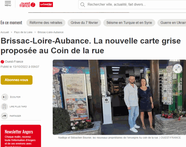 Dans cet article, Ouest France parle d'un nouveau service carte grise proposé par le bureau de tabac "Au coin de la rue" propose. Ce service de proximité est simple, rapide et efficace ! Les clients peuvent venir faire leur carte grise et la recevoir sous 72 heures*